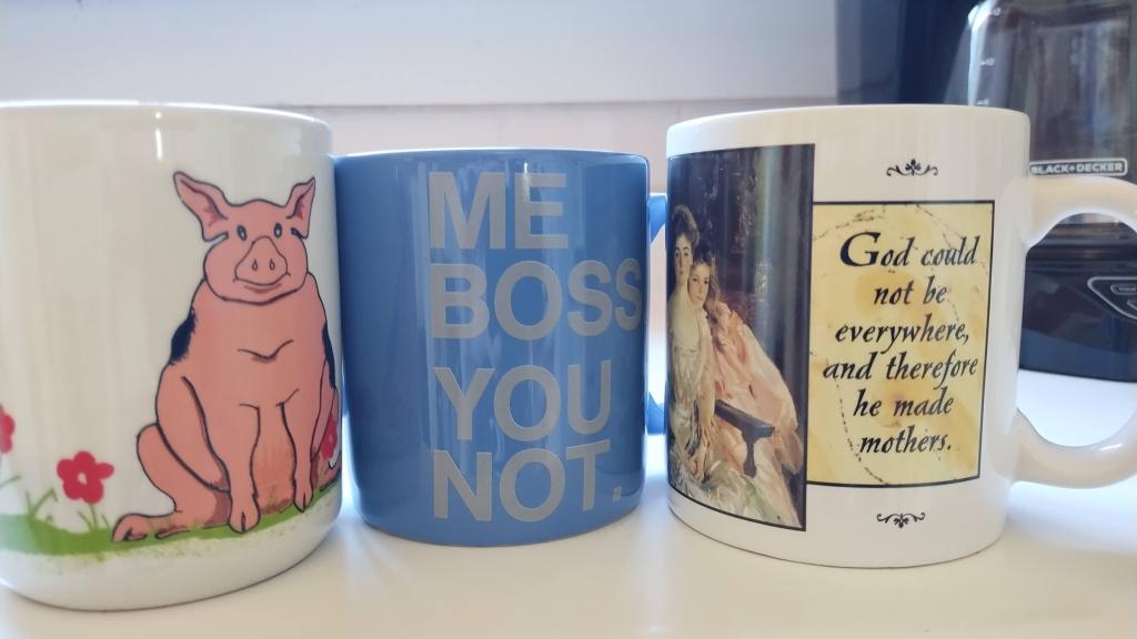 When she passed away, and I was cleaning out her apartment, she had so many coffee mugs, I wasn’t sure what to do with them all. Of course, I wanted them all for myself, but I knew I didn’t have enough space (as most of my cupboards were already filled with funny mugs that Mum had given me as gifts).